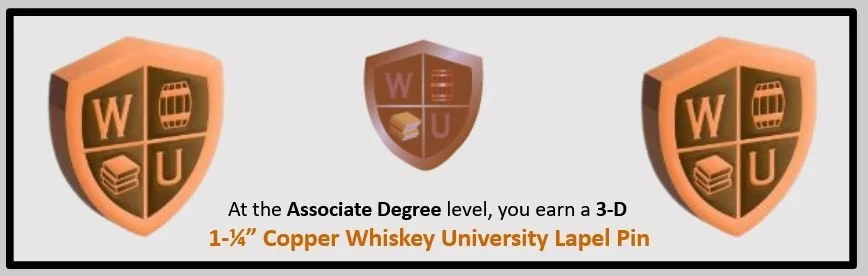 The student also earns a 3-D 1-1/2” COPPER Whiskey University Lapel Pin to wear in public or to events and the privilege of being a Degree Graduate. If you will be teaching classes for us, you will also receive a Whiskey University E-mail address.