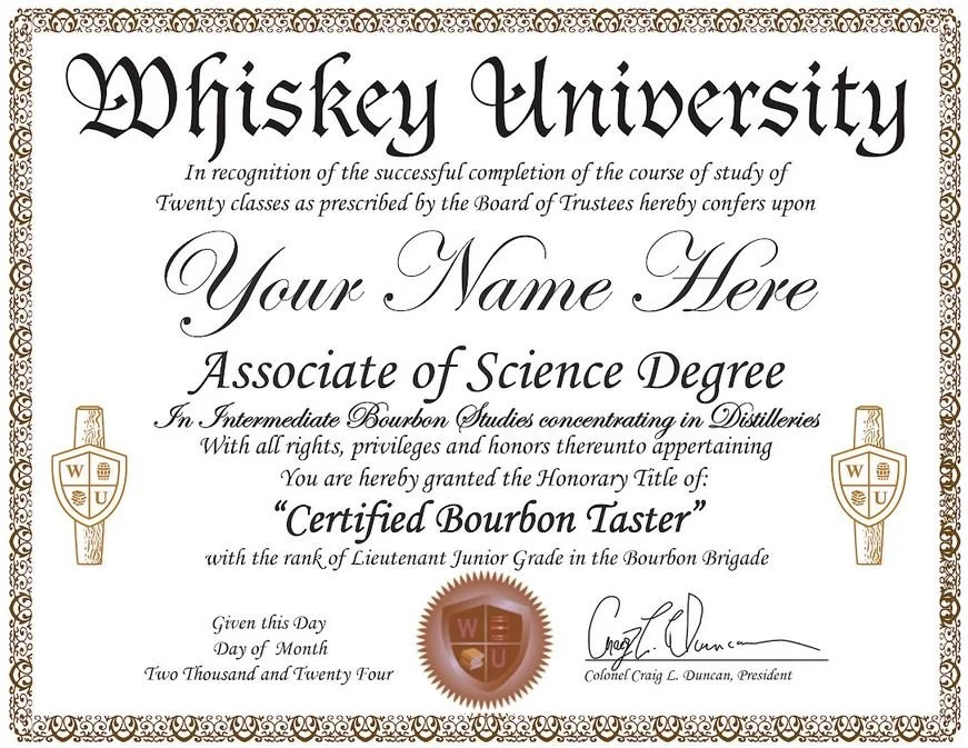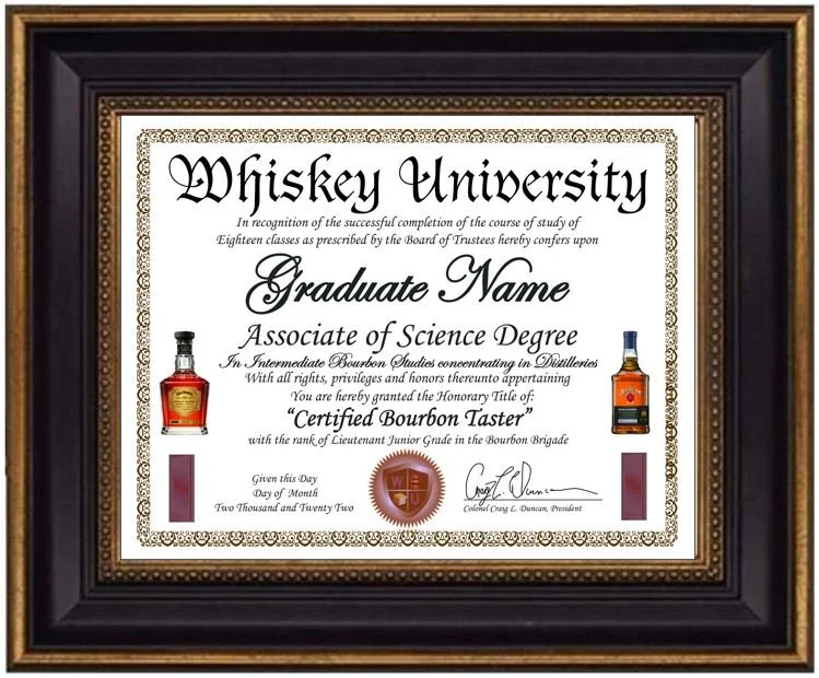 Upon Graduation, you will receive your 8-1/2” x 11” Parchment Associate Degree and a Frame as well as earn the title of “Certified Whiskey Taster” with the Commensurate Officer Rank of Lieutenant Junior Grade in the “Bourbon Brigade”.