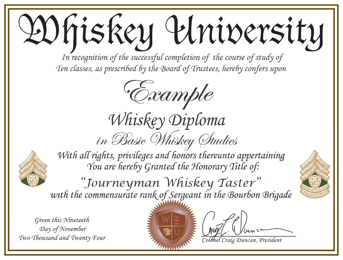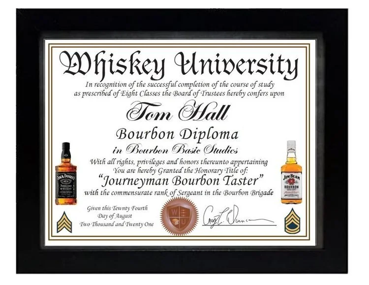 Upon Graduation you will receive your 8-1/2” x 11” Parchment Diploma suitable for framing and earn the title of “Journeyman Whiskey Taster.” Upon completion of your Whiskey Diploma you will earn the Commensurate Rank of Sergeant in the “Bourbon Brigade” and you will receive an invitation to attend one additional class, FREE of charge on Zoom.