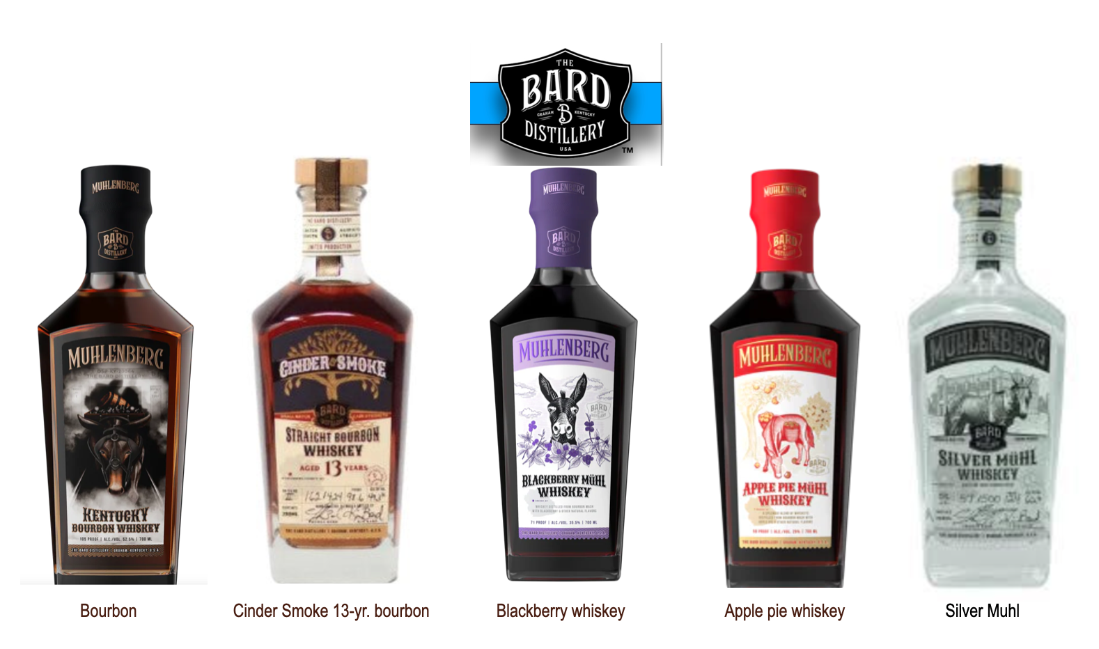 From its early public life, The Bard featured a core lineup of three whiskeys that established its identity. Muhlenberg, a Kentucky straight bourbon, serves as the house expression and nods directly to the county that shaped Bard’s upbringing.Cinder Smoke, a 13-year-old bourbon, reflects a bolder, more mature style.Silver Muhl is an unaged white whiskey that highlights grain character and distillate clarity. Alongside these, The Bard offers a number of flavored whiskeys, designed to broaden appeal and reflect the approachable, visitor-driven nature of the distillery.