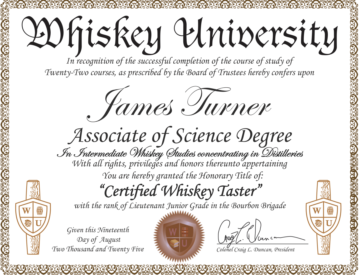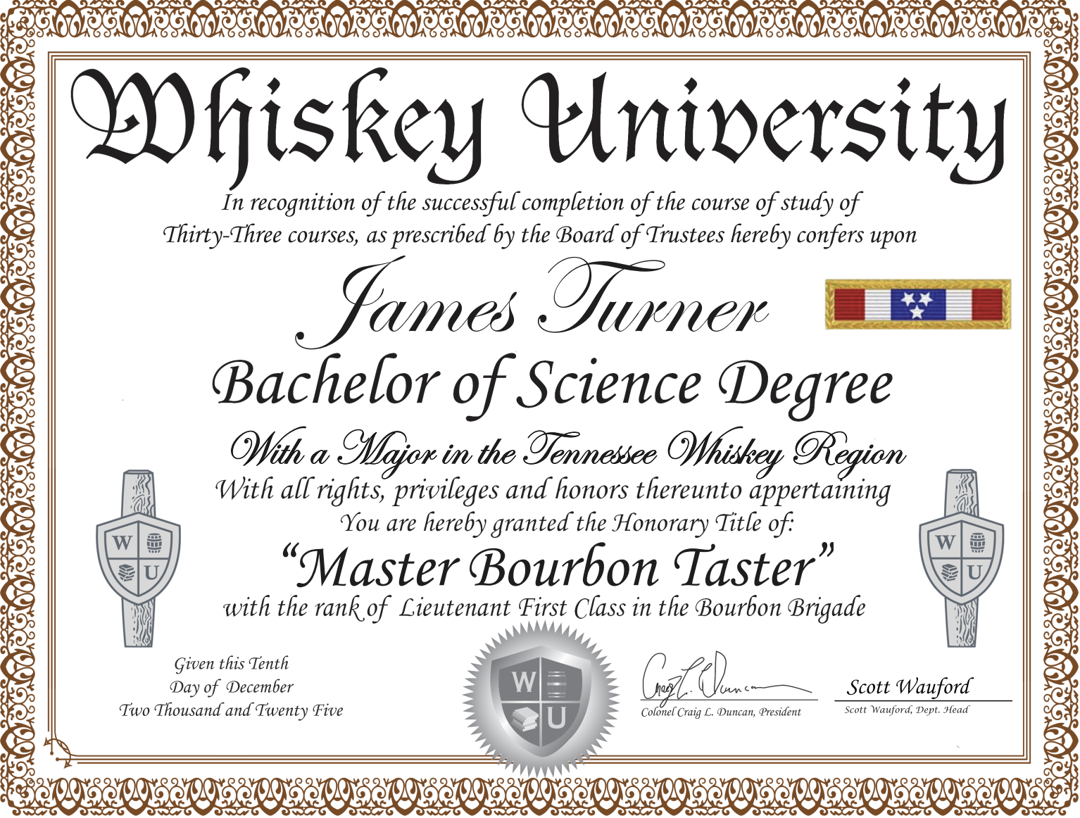 On February 6th, 2022 Jay earned his Bachelor of Science Degree with 25 classes at Whiskey University. Jay followed that up by earning his Bachelor of Arts Degree in short order at 30 classes on April 3rd, 2022. With that degree Jay became a "Master Bourbon Taster" with the rank of Captain in the Bourbon Brigade.