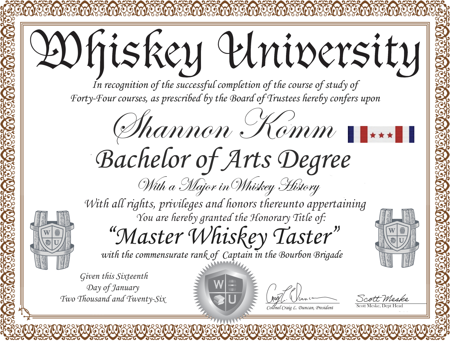 Shannon Komm began her journey with Whiskey University in January 2025 and quickly distinguished herself as a passionate student of the craft. By October, she had earned her Bachelor of Arts in Tennessee Whiskey, and today she proudly serves as a Master Whiskey Taster and a Captain in the Bourbon Brigade.