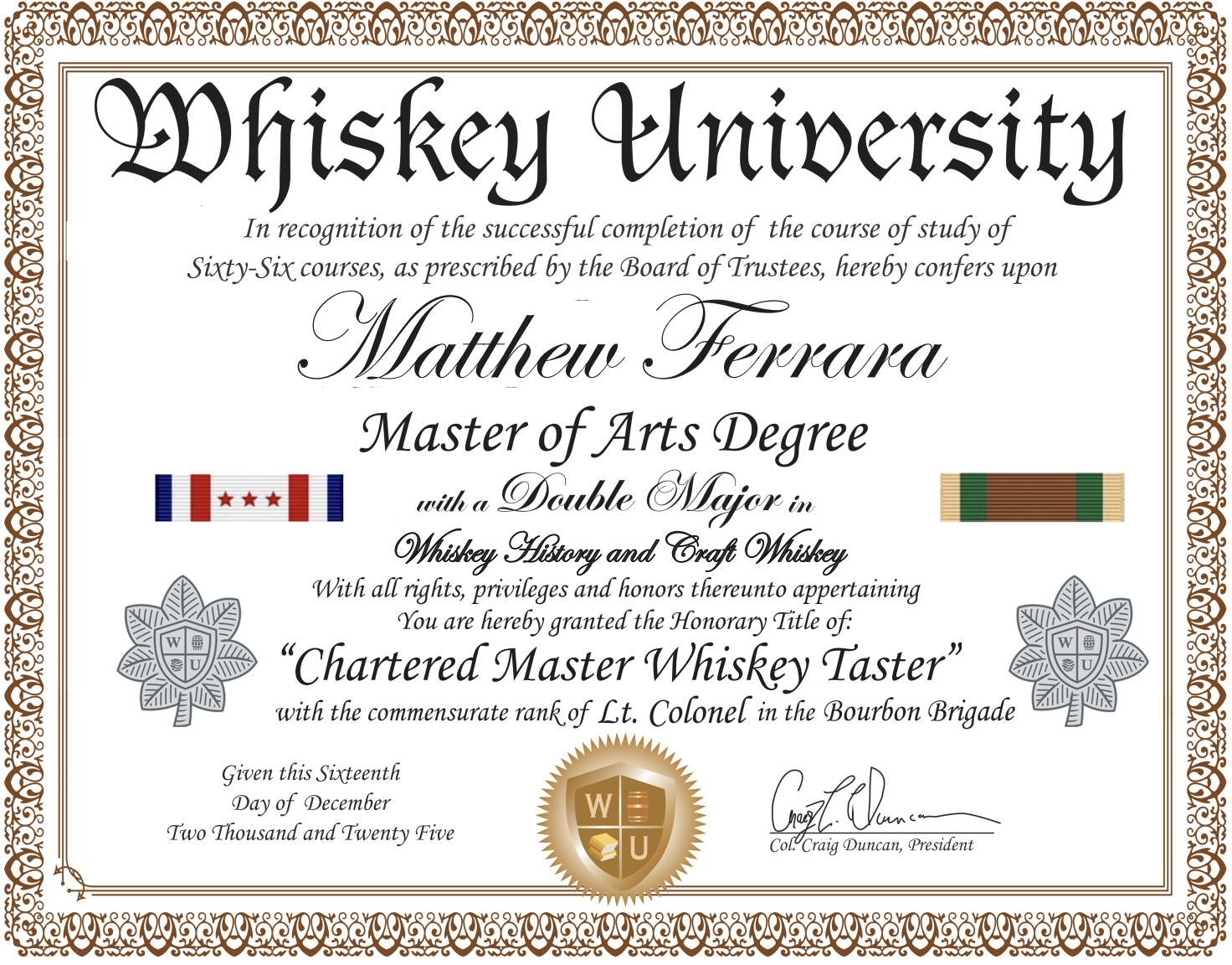 Robert Pomerenk's journey with Whiskey University began in September of 2023. In December of that year, he earned his Associate of Science degree, gaining the title of "Certified Bourbon Taster". Robert continued his studies and in March 2024, he achieved his Bachelor of Science degree, earning him the distinguished rank of "Master Bourbon Taster" and the commensurate officer rank of 1st Lieutenant in the "Bourbon Brigade."