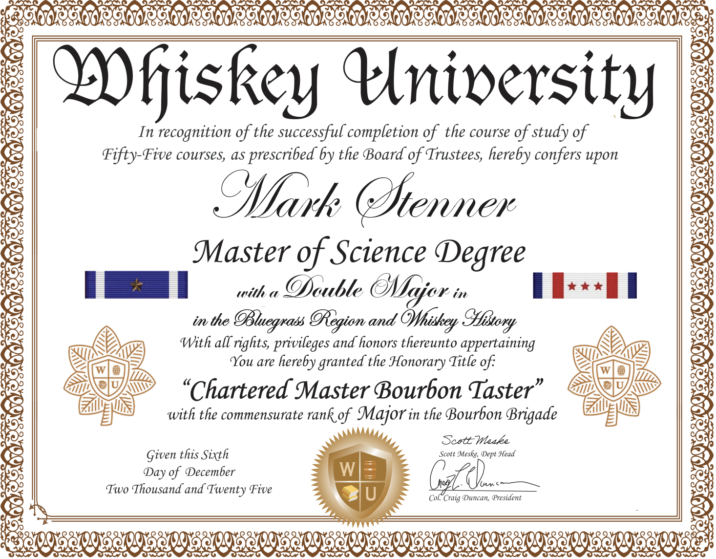 Paul then earned his Master of Science Degree majoring in the Bourbon Capital region in June 2022 after completing his 45 classes earning the title “Chartered Master Bourbon Taster" and the Commensurate Senior Officer Rank of Major in the “Bourbon Brigade.” Continuing on in his education, Eggerding then earned his Masters of Arts Degree on October 12th, 2022 after completing a total of FIFTY FOUR (54) Tasting Classes. Whiskey University then bestowed title of “Chartered Master Whiskey Taster” and the Commensurate Senior Officer Rank of Lieutenant Colonel (the highest rank awarded by Whiskey University) in the “Bourbon Brigade.”