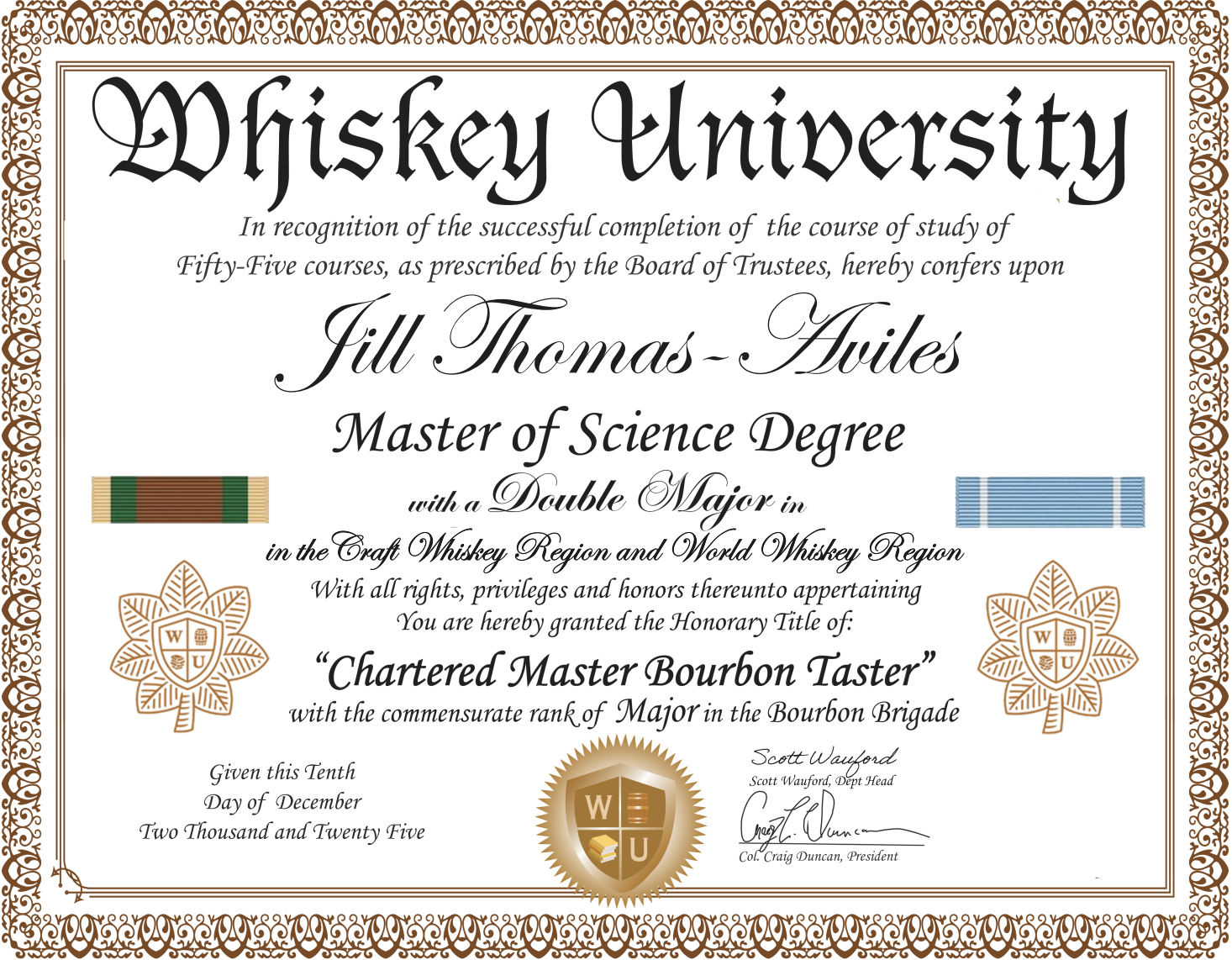 Jill’s progress through Whiskey University has been nothing short of remarkable. Just weeks after enrolling, she earned her Rye Whiskey Certificate in November 2024. From there, she dove in wholeheartedly—earning her Whiskey Diploma and the title of Journeyman Whiskey Taster in February 2025, followed by her Associate Degree as a Certified Bourbon Taster that spring. By July, her dedication paid off again with her Bachelor of Science Degree, earning her the distinction of Master Bourbon Taster. Most recently, in September 2025, Jill achieved her Bachelor of Arts Degree and was commissioned as a 1st Lieutenant in the Bourbon Brigade. Today, she continues her studies, proudly pursuing her Master of Arts Degree while savoring her favorite—rye whiskey.