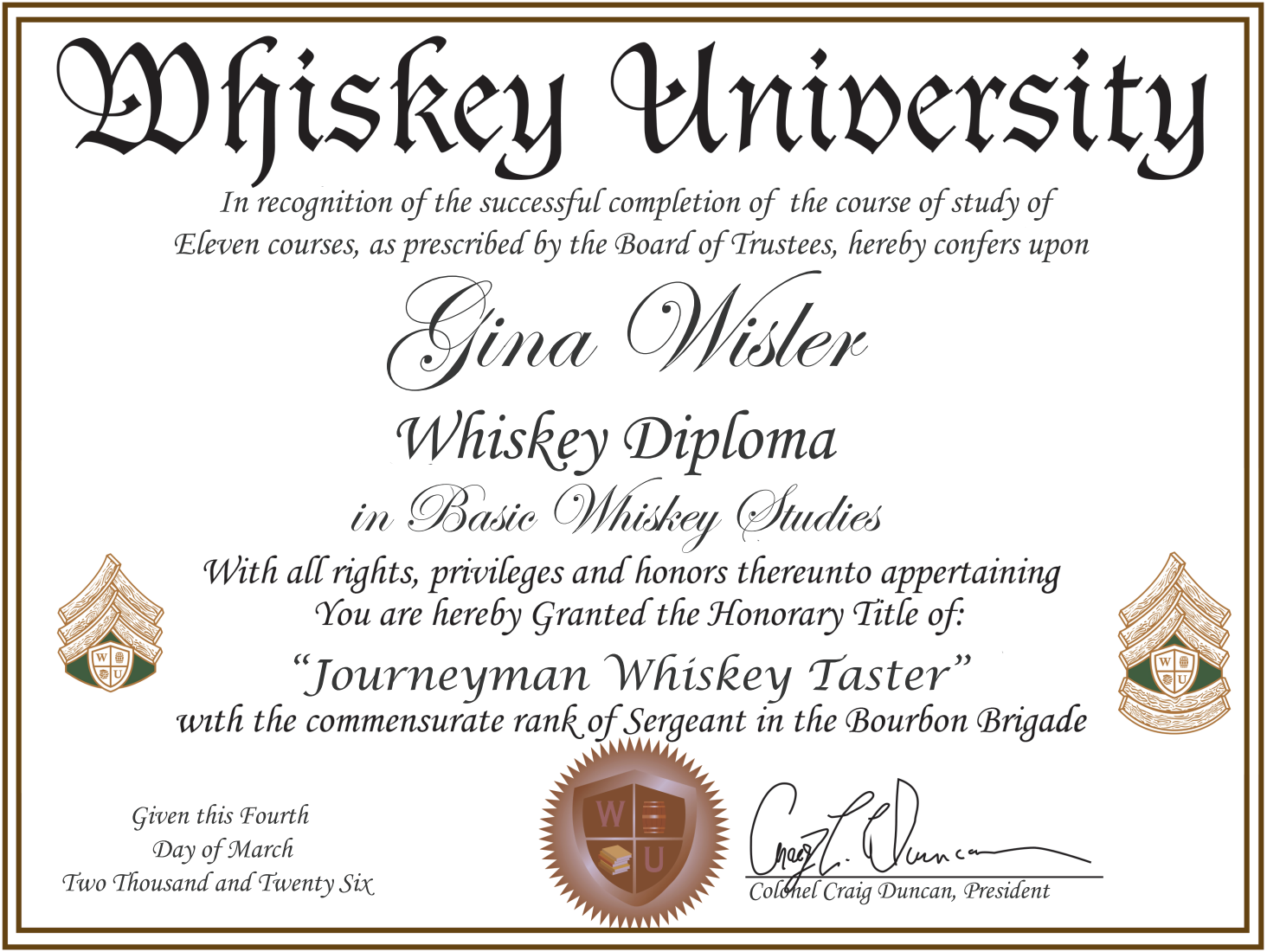 Rector earned his Associate Degree after passing 15 classes on March 30th, 2021. On July 13th, 2021, John earned his Bachelor of Science Degree with 24 classes, at Whiskey University and the title of "Adjunct Master Bourbon Taster." On September 7th, 2021 Captain Rector advanced to earn the Title of “Master Bourbon Taster” by earning his Bachelor of Arts Degree and the rank of Captain in the Bourbon Brigade. John is pursuing his a Graduate Degree currently.