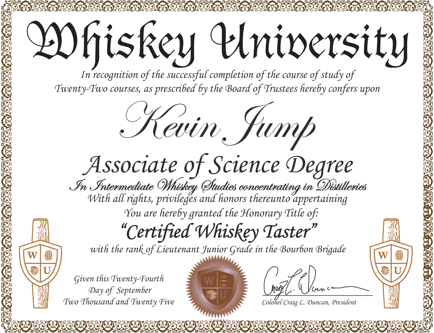 Becca is a graduate of the Spring Class of 2022, graduating from Whiskey University on February 6, 2022, where she earned her Associate of Science degree with 19 classes, and the title of "Certified Bourbon Taster".