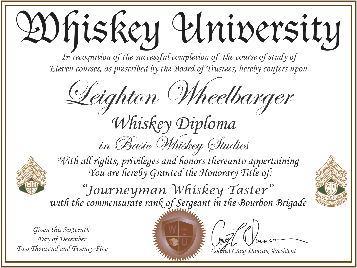 Bill received his Associates of Science degree and the title of "Certified Bourbon Taster" in December of 2022. Ultimately, Bill completed over 70 classes, as he progressively achieved his Bachelors of Science, Bachelors of Arts, Masters of Science and Masters of Arts degrees during that time. His three majors were the Bourbon Capital Region, Blue Grass Region, and the Maryland Rye Region. Bill is now a “Chartered Master Whiskey Taster” with the rank of Lt. Colonel in the Bourbon Brigade. Additionally, Bill is so committed to Whiskey University, that he pursued becoming a member of the esteemed Whiskey University Board of Directors.