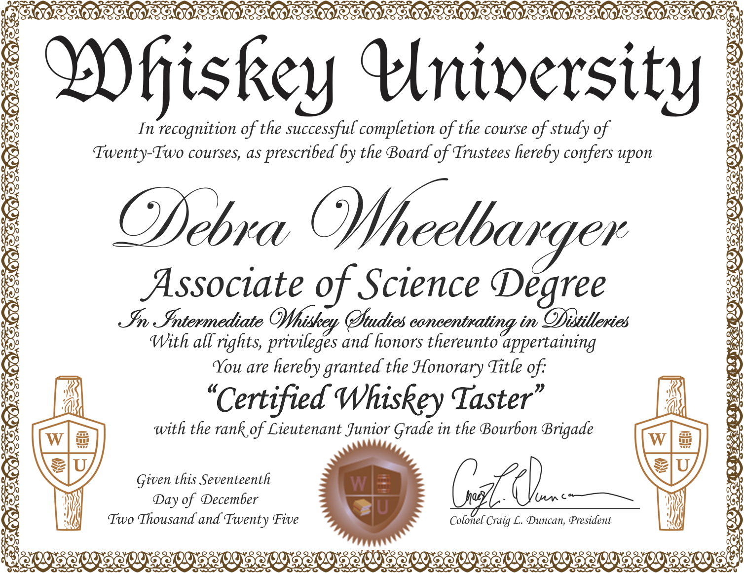 Vicki received her Associates of Science degree and the title of "Certified Bourbon Taster" in December of 2022. Ultimately, Vicki completed over 70 classes, as she progressively achieved her Bachelors of Science, Bachelors of Arts, Masters of Science and Masters of Arts degrees during that time. Her three majors were the Bourbon Capital Region, Blue Grass Region, and the Maryland Rye Region. Vicki is now a “Chartered Master Whiskey Taster” with the rank of Lt. Colonel in the Bourbon Brigade. Additionally, Vicki is so committed to Whiskey University, that she pursued becoming a member of the esteemed Whiskey University Board of Directors.