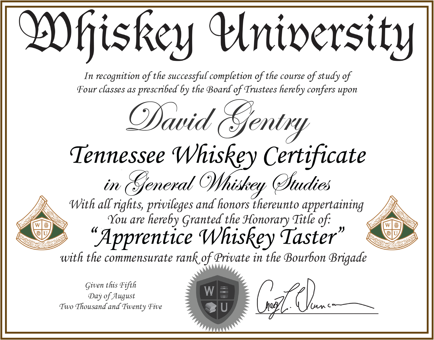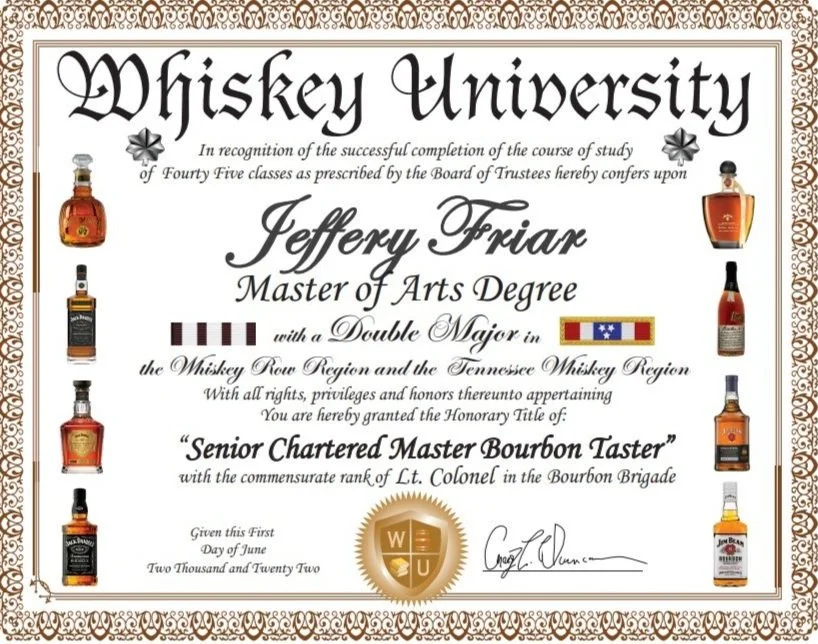 Lt. Col. Jeff Friar has been a member of Whiskey University since May 2021. In 2016 Whiskey University began offering Certificates, Diplomas and Degrees. Friar is rapidly working his way through the entire seven degree program at warp speed. He has earned the highest title of a “Chartered Master Whiskey Taster” and has earned his Master of Arts Degree from Whiskey University with a Double Major in The Bourbon Capital Region and The Tennessee Whiskey Region.