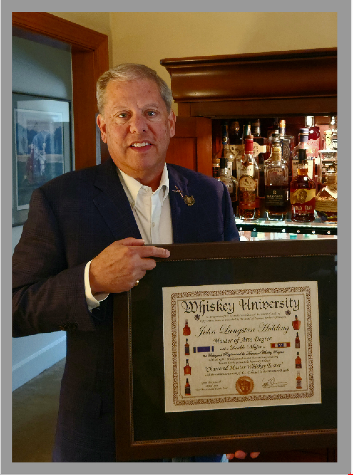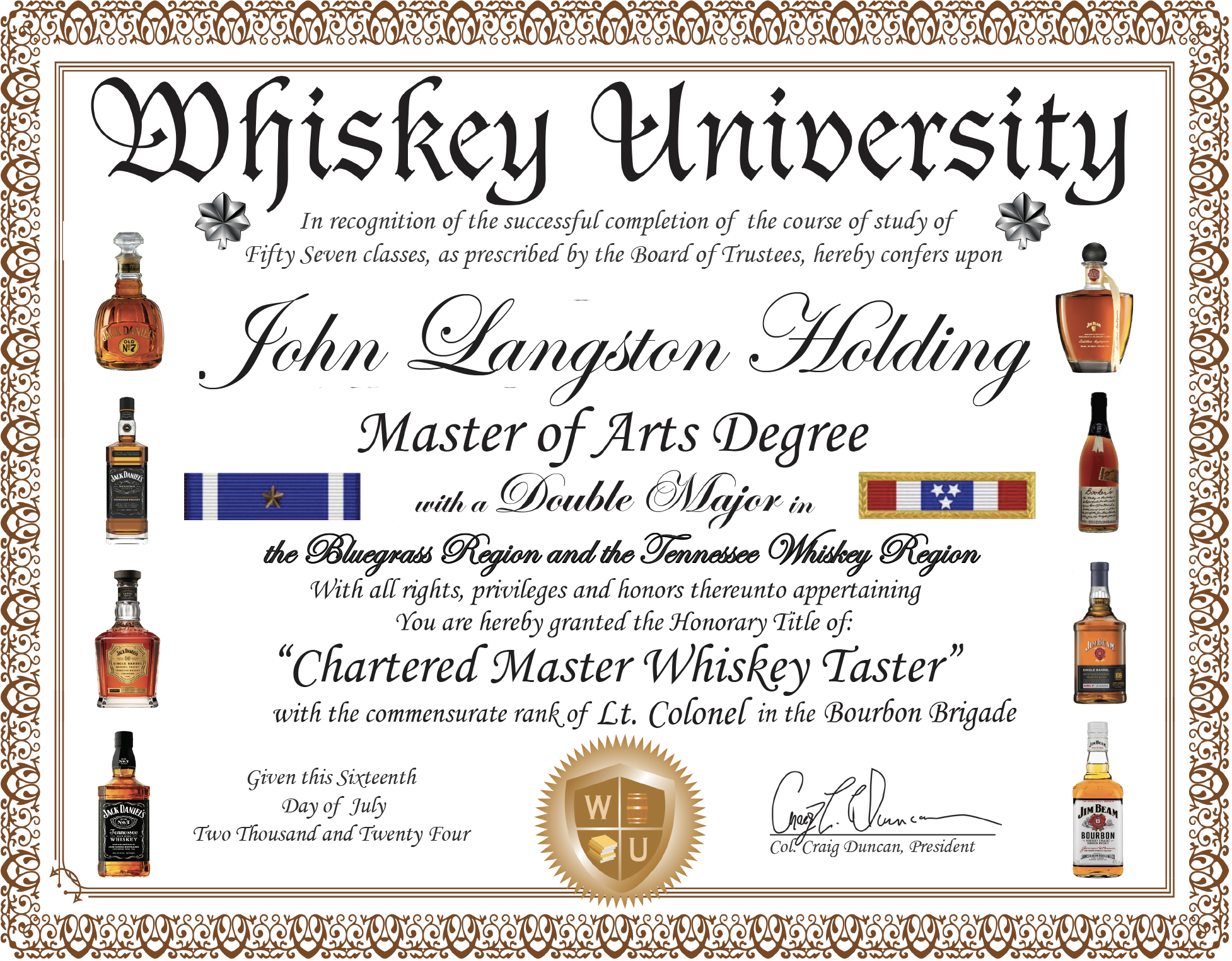 Lt. Col. Lang Holding has been a member of Whiskey University since March 2023. In 2016 Whiskey University began offering Certificates, Diplomas and Degrees. Lang has rapidly worked his way through the entire seven-degree program within a year and a half of joining. He has earned the highest title of a “Chartered Master Whiskey Taster” by earning his Master of Arts Degree with a Double Major in The Bluegrass Region and The Tennessee Whiskey Region.