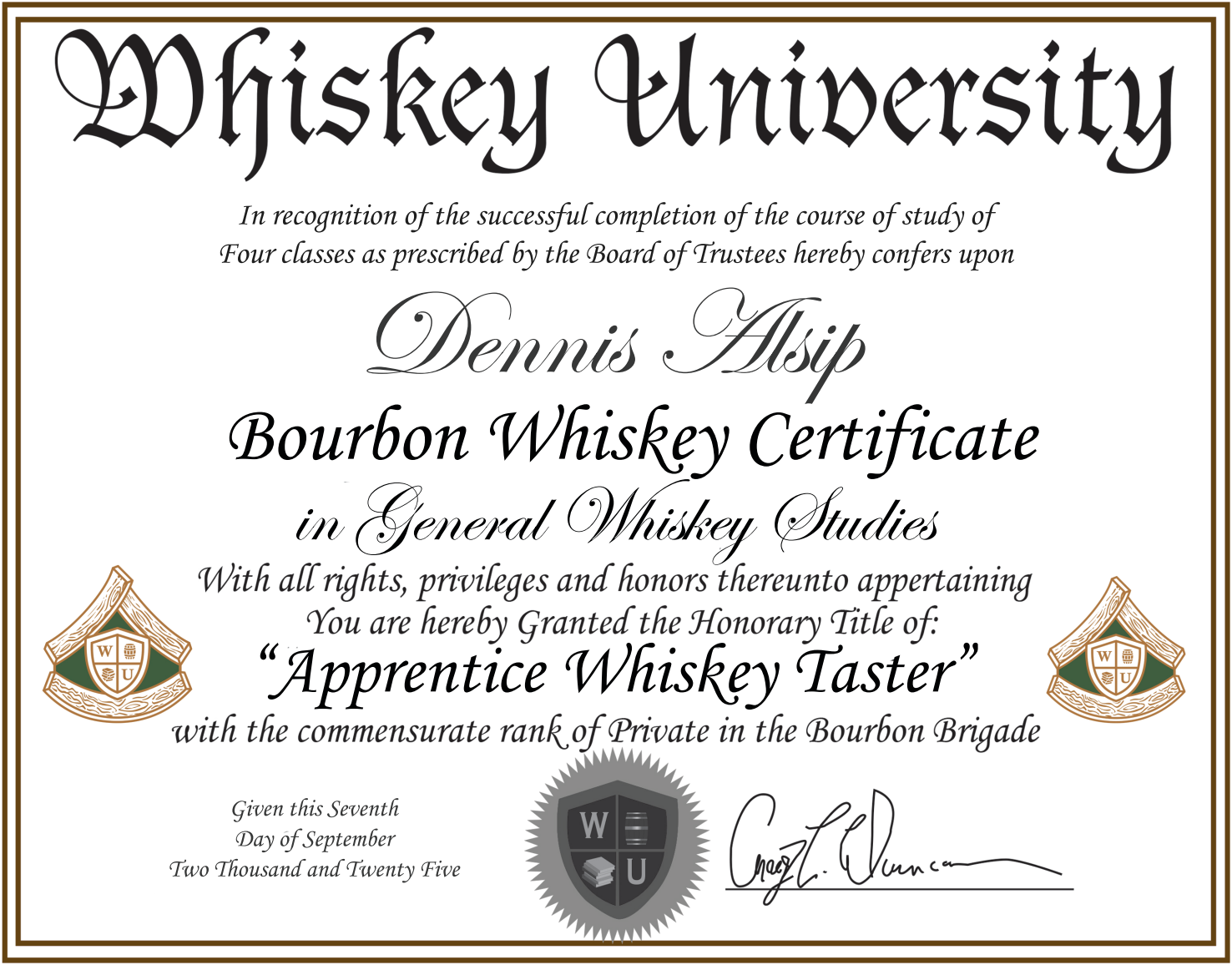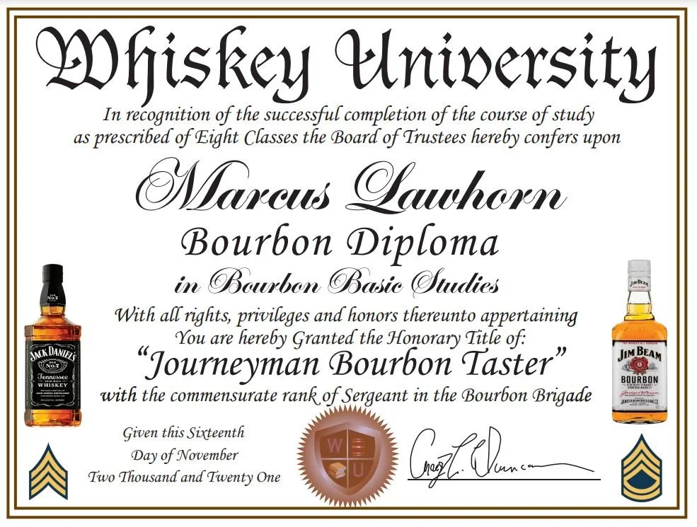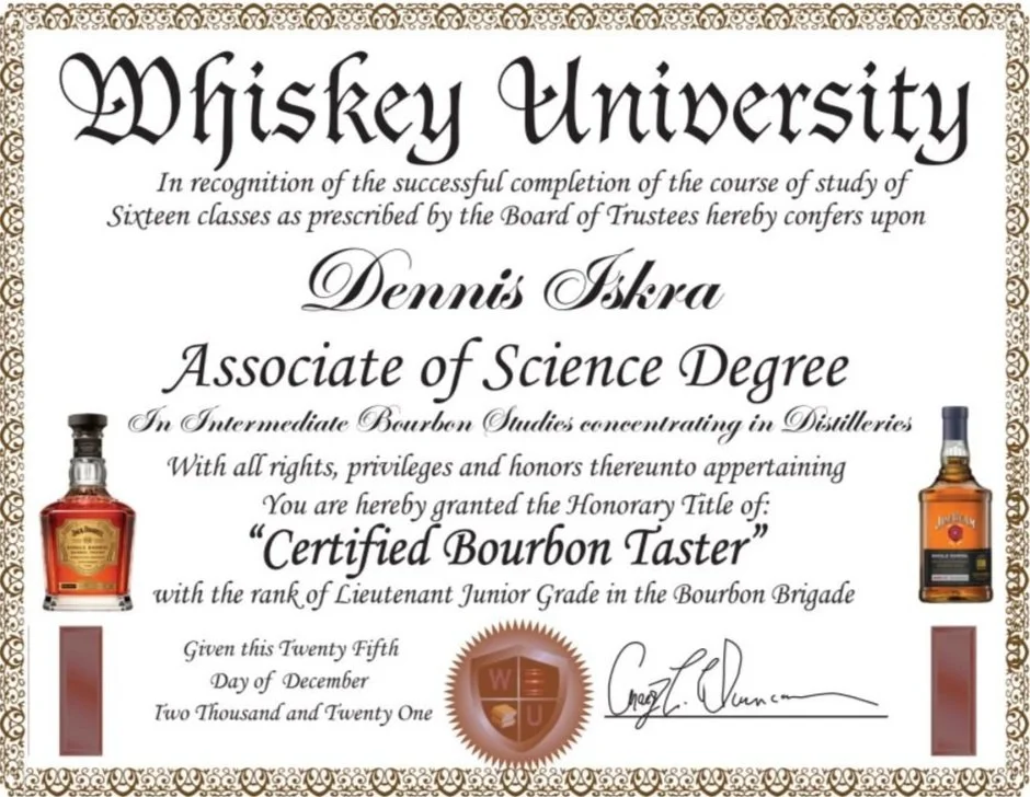 Jeff earned Bourbon Diploma on July 7th, 2021 and his Associate Degree after passing 19 classes on September 19, 2021. Friar is also a Recruiter for Whiskey University. He went on to earn his Bachelors of Science Degree with 29 classes, the title of "Certified Master Bourbon Taster" on November 16th, 2021. Friar earned the rank of Captain in the Bourbon Brigade with his Bachelors of Arts Degree on December 12th, 2021 after successfully completing 38 classes.