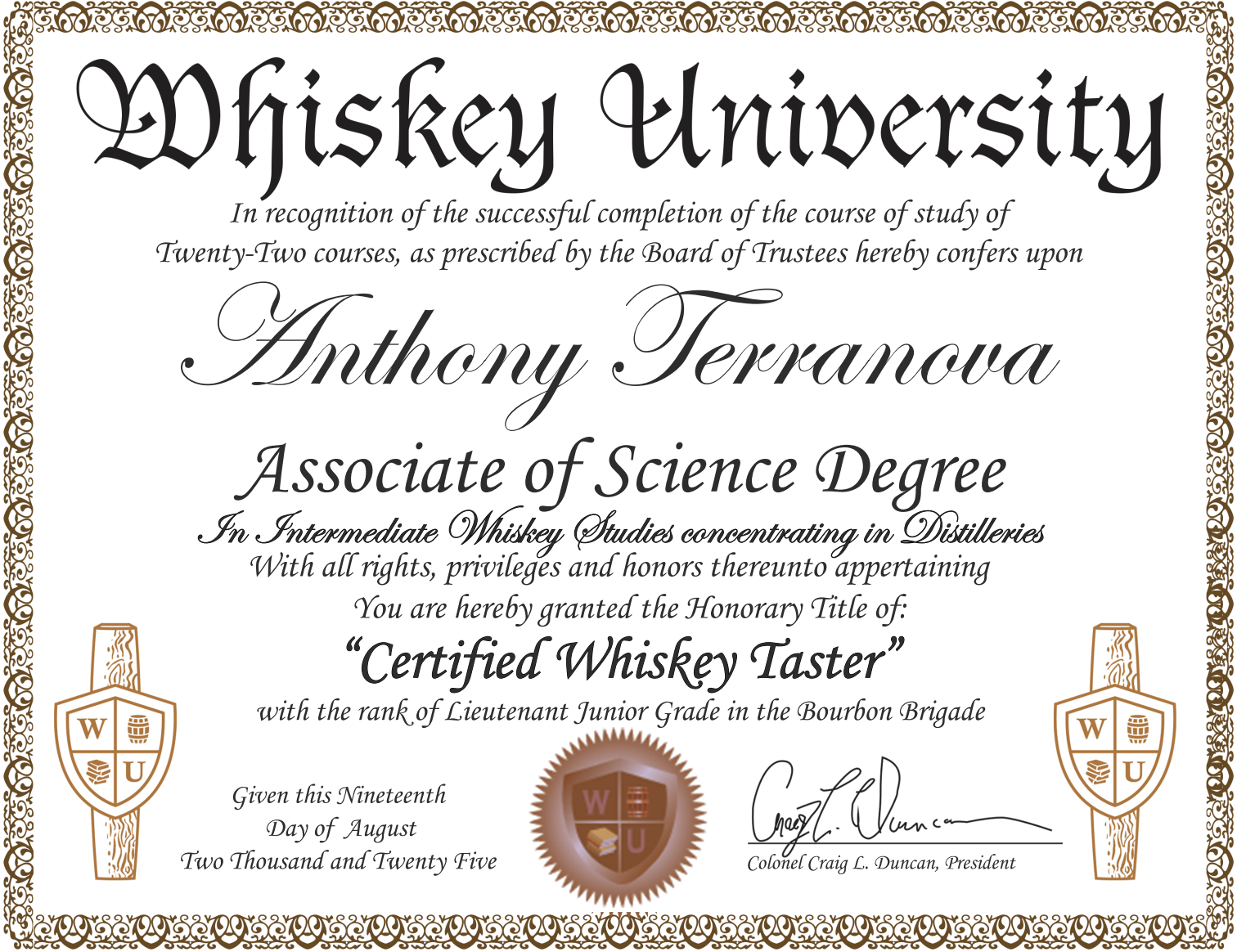 Andy earned his Associate Degree after passing 15 classes on February 17th, 2021. Andy taught his first class on June 23rd 2021, when he taught the “Bourbon 201 class. He has also taught “The Whiskey Row Region”, “The Bourbon Capital Region” and the Maker’s Mark Brands Tastings. On July 7th, 2021, Chirip earned his Bachelor of Science Degree with 24 classes, at Whiskey University and the title of "Adjunct Master Bourbon Taster" and the rank of First Lieutenant in the Bourbon Brigade. On September 7th, 2021 Captain Chirip advanced to earn the Title of “Master Bourbon Taster” by earning his Bachelor of Arts Degree and the rank of Captain in the Bourbon Brigade. Andy became one of the first 40 graduate students to earn his Master of Science Degree and the rank of Major in the Bourbon Brigade on October 7th, 2021. Lt. Colonel Chirip obtained the highest degree awarded by Whiskey University on November 15th, 2021 when earned his Master of Arts Degree and became a Senior Chartered Master Bourbon Taster.