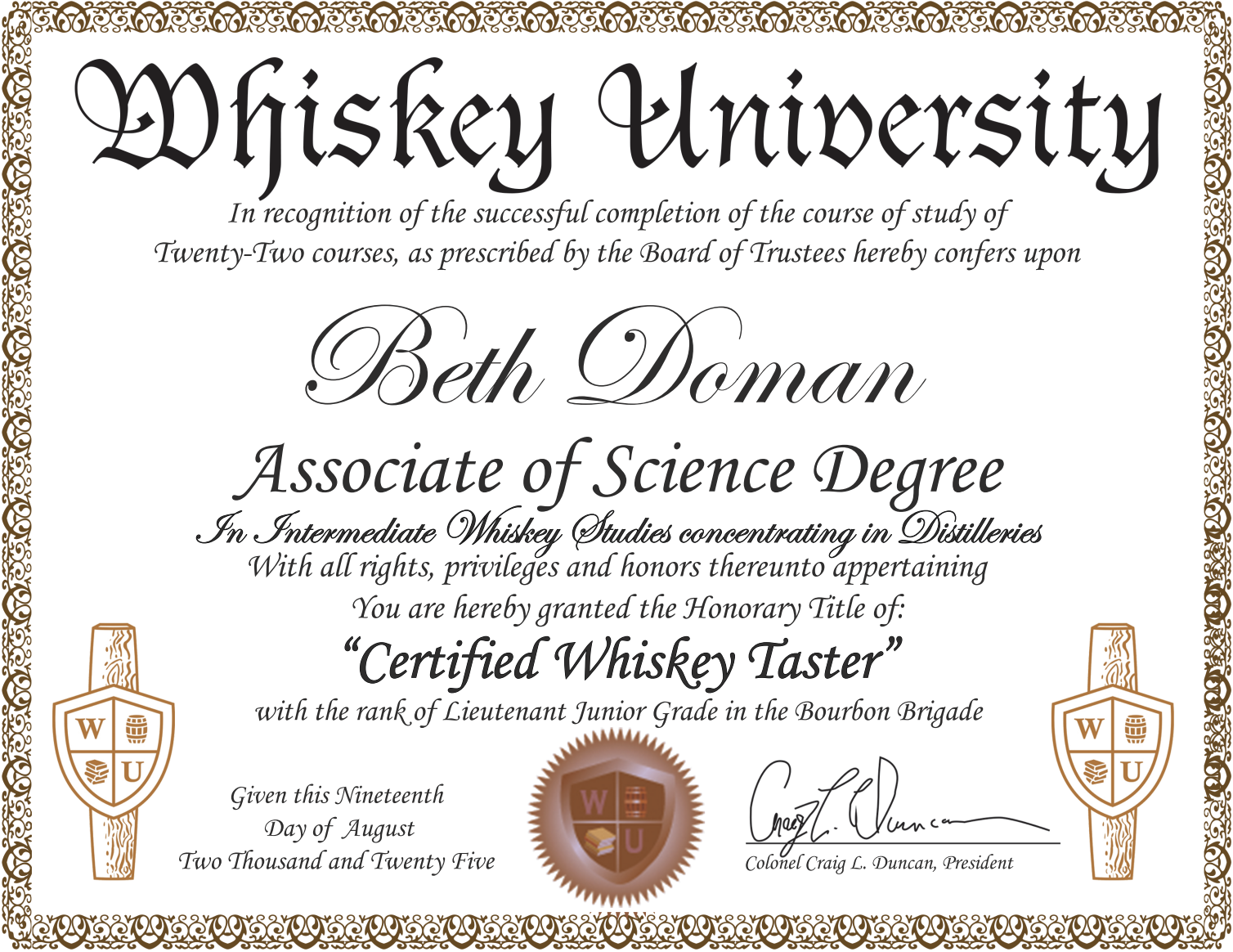 Moore graduated on July 13th, 2022 with his Master of Science Degree , the title Chartered Master Bourbon Taster and the rank of Major in the Bourbon Brigade upon the successful completion of 42 classes. On December 6th, 2022 Professor Ian Moore reached the peak of the mountain by earning Whiskey University’s highest degree at 50 classes in the Master of Arts Degree with the accompanying title of “Chartered Master Whiskey Taster” and the rank of Lt. Colonel in the Bourbon Brigade.