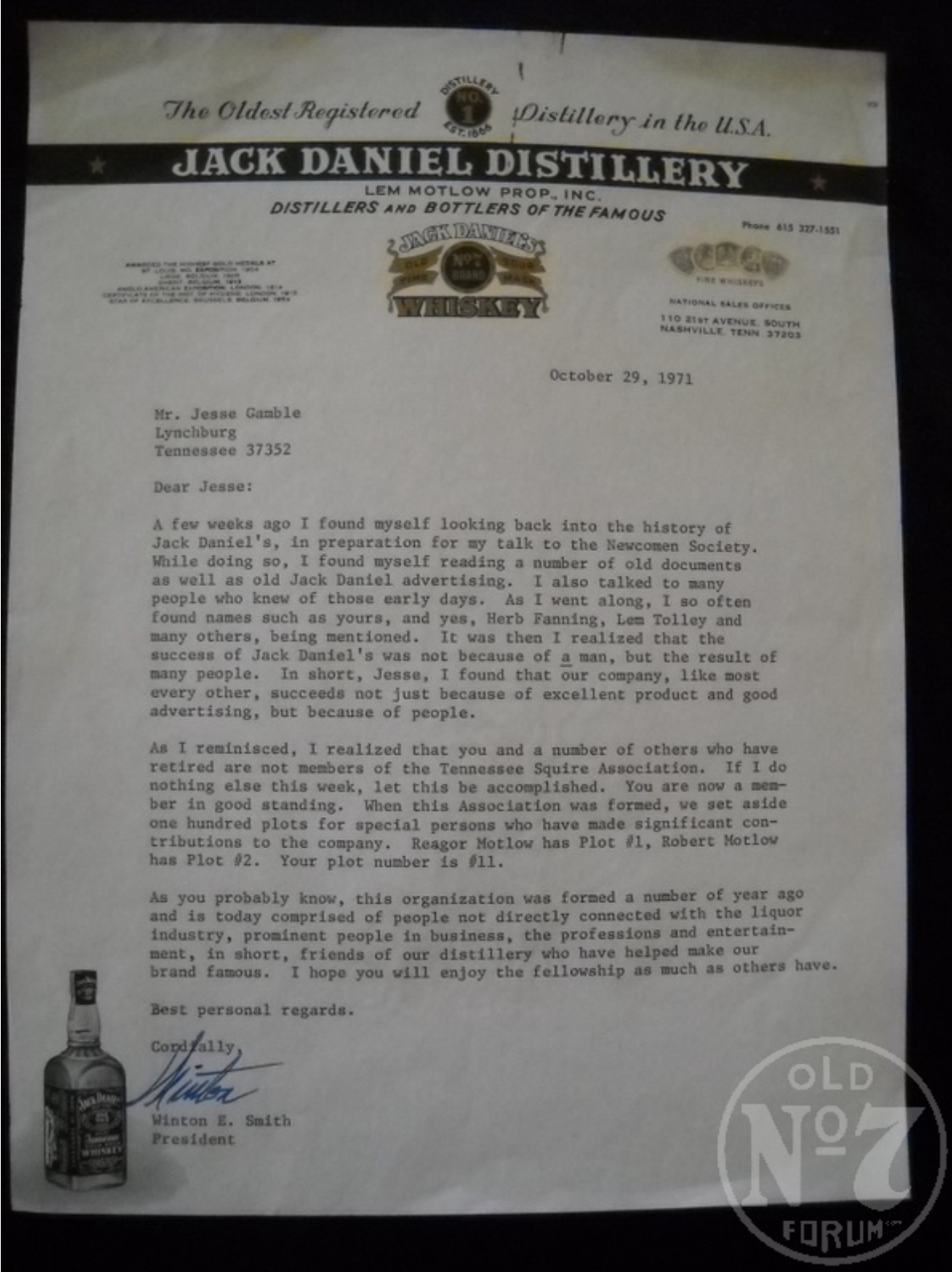 1971 letter from Jack Daniel’s President Winton Smith to former Master Distiller Jess Gamble, nominating Gamble to become a Squire.