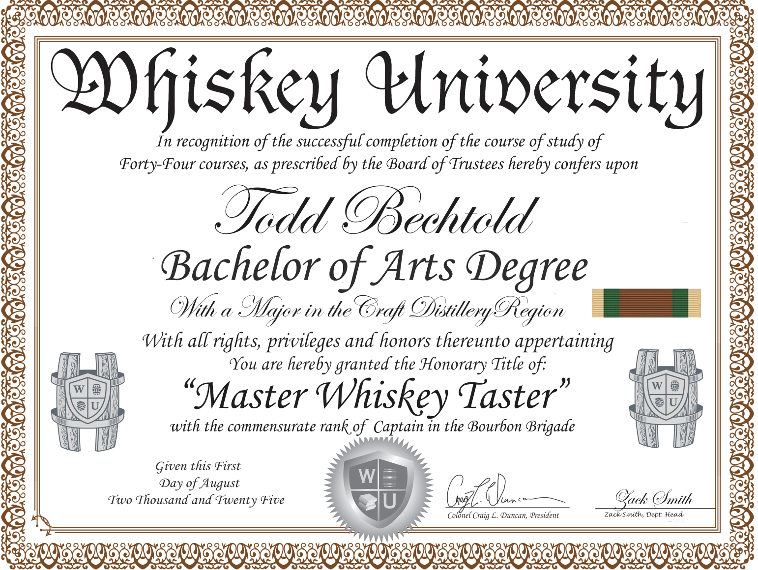 Todd Bechtold has been proudly enrolled in Whiskey University since January 2025, immersing himselfin a spirited journey of discovery, tradition, and craftsmanship. Whiskey University, founded in 2016, offers Certificates, Diplomas, and Degrees as part of a unique credentialing path for whiskey and bourbon enthusiasts. Todd first discovered the program when Colonel Craig shared a post in a local whiskey Facebook group he was active in. Intrigued, Todd jumped in—and never looked back.